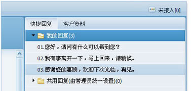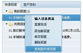 快速回复功能除了员工自行设置快捷回复语之外,还支持快速回复内容的共享,每个工号都可以在“我的回复”区域里右键点击,将自己的快速回复内容复制到共享回复中,便于其他工号在答复咨询时使用。