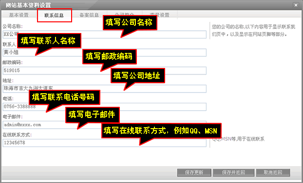 联系信息主要填写公司名称联系人邮政编码地址电话电子邮件线联系方式,填写完后记得点击保存更新。