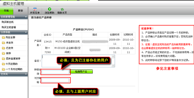 3、注意:虚拟主机附送的产品如邮局数据库等,也会跟着虚拟主机的转移而一起转移过去。